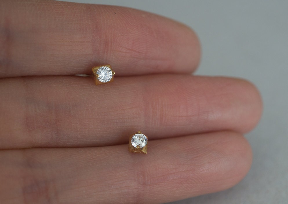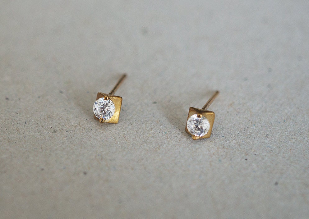 Include : 1 pair of studs earrings & gold-backs(select option) / black paper package Material : 10K solid Gold (not plating), Cubic Zirconia measures approx. 3.5 x 3.7 mm Length / thickness of Post : 9 mm / 0.6 mm