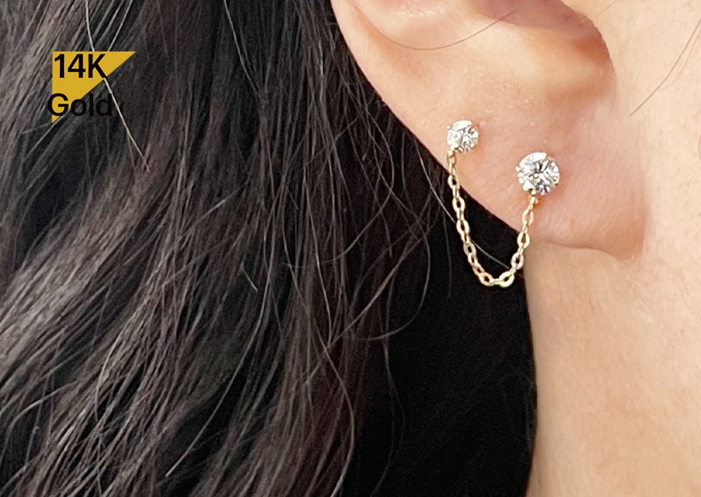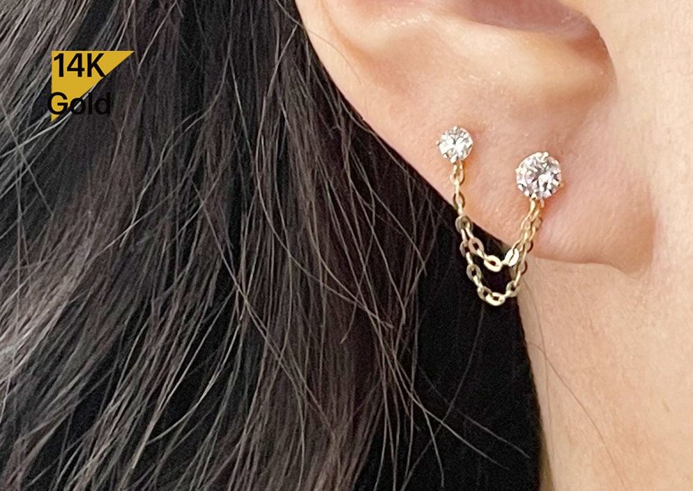 Material : 14K Solid Gold / Double stud earring ( 1 SINGLE) CZ size (white) : 3mm & 4mm Chain Length : 25mm(single) / 17.5+25mm(double)